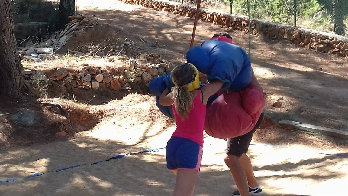 Fight with Giant foam-filled gloves in the sand ring where your mission is to not fall out of the ring or on the floor!